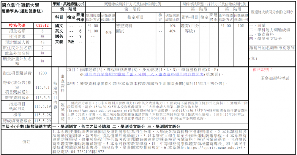 公告本系115學年度大學申請入學【運動健康組】校系分則